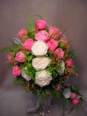 ホワイトローズを中心にピンクローズと濃淡のグリーンや実物をあしらって、ナチュラル感覚のブーケにして欲しいとのご希望で写真のようなオーバル風にデザインしました。