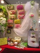 右のウエディングケーキの作品は、EMIKOお菓子教室主宰、フレッシュアートフラワー協会認定講師でもある中里惠美子先生制作のぷり花ケーキです。
